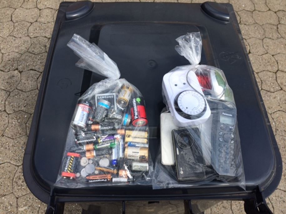 Batterier og småt elektronik kan du enten aflevere på genbrugspladsen, lægge i den røde kasse eller komme i gennemsigtige poser på op til fire liter som stilles på beholderen med rest- og madaffald. Brug én pose til batterier og én pose til småt elektronik. Læs mere om dette nederst på denne side.